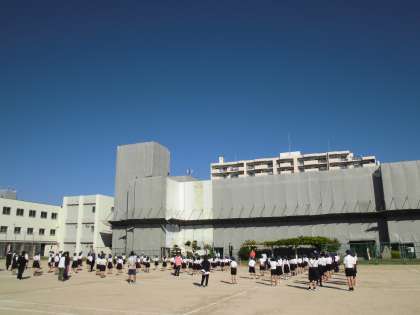 雲一つない秋空の下、全校朝会を行いました。校長先生が「空を見てごらん」と言うと西の空にお月さまを観察することができました。来週の10月4日(月)はみんなの体育の日です。それぞれの学年で取り組んでいることを頑張りましょう。とお話されました。