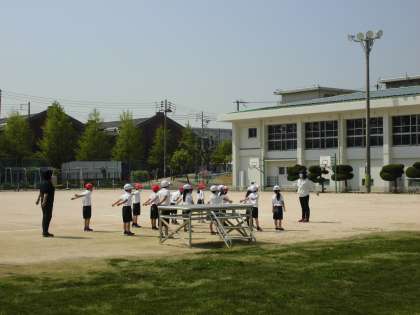 1年生は運動場で体育科の学習に取り組んでいました。しっかり準備体操をして、その後、かけっこをしたり、けんけん遊びをしたり、とても楽しそうに活動していました。