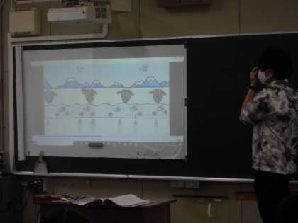 築港小学校では13:30〜40英語の短時間学習に取り組んでいます。2年生が音楽と映像に合わせて、英語の学習に取り組んでいました。とても楽しそうに活動をしていました。