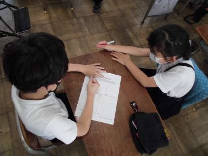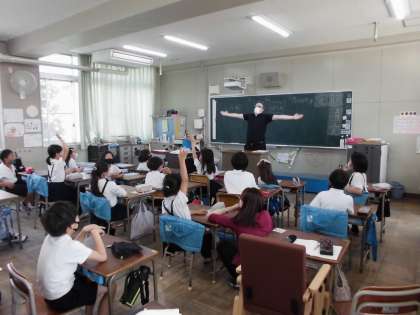 今日はマニー先生が来校し、英語の学習を行いました。4年生では、マニー先生の自己紹介と「Dots and Boxes」ゲームをしました。子どもたちは友だちとペアになって楽しそうに活動していました。