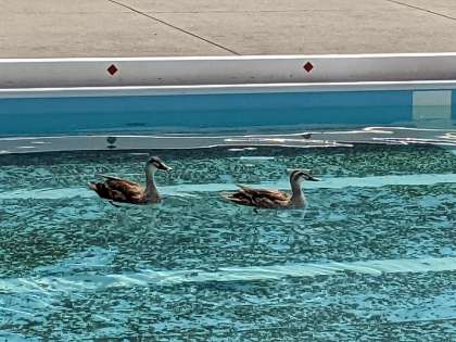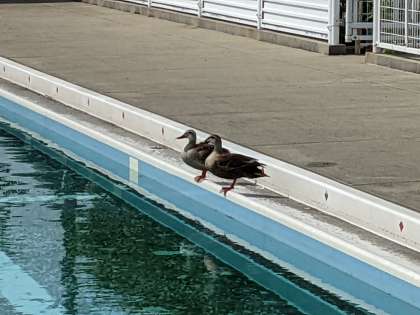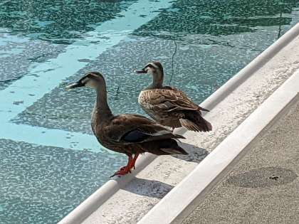 プール清掃をするためプールに行くと、なんとカモが二羽いました。今日は暑いので気持ちよさそうにプールで泳いだ後、仲良く飛び立って行きました。