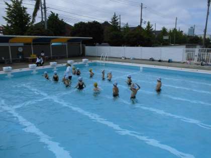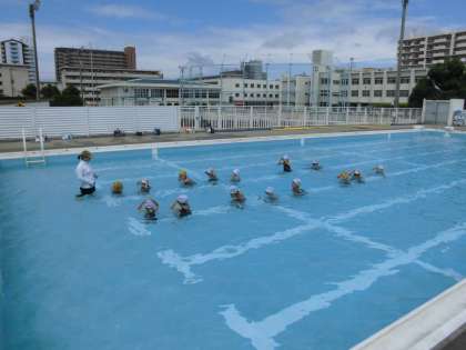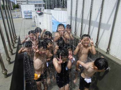 2時間目、1年生はプール水泳の学習でした。準備体操を入念に行い、その後、シャワーをしっかり浴びることができました。子どもたちは小学校のプールにドキドキしながら、水の冷たさにとても気持ちよさそうに入っていました。水なれで、顔をつけたり、水のかけ合いっこをしたりととても楽しそうに学習に取り組むことができました。