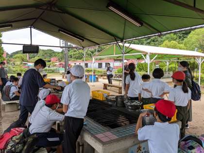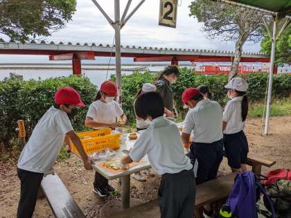 お昼ごはんはカレーライスです。お米を洗う人、野菜を切る人、薪に火をつける人。担当に分かれて協力して作りました。水の量が多くてスープカレーになったところもありましたが、一生懸命作ったカレーライスはおいしかったです。とてもよい天気になってきました。