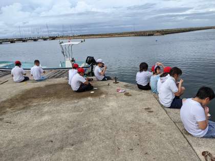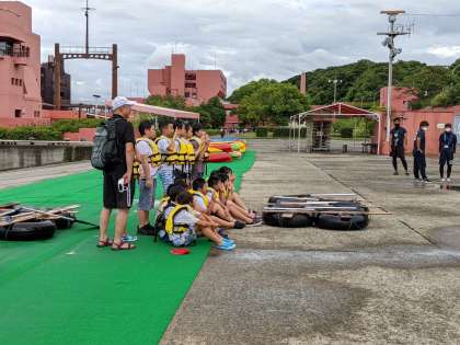 いかだこぎの後は、記念写真を撮りました。その後、アイスクリームを食べました。「冷たくておいしかった」と笑顔の子どもたち。雨は降らず、暑いくらいによい天気になりました。