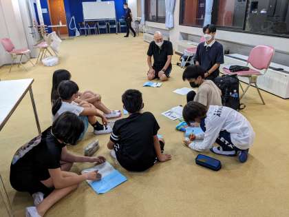 よかったところと反省点、明日の活動について担任の先生から話を聞きました。子どもたちの感想は、カレーがおいしかった、ヨットができなかったけれどいかだが楽しかった、いろいろできて楽しかったと感想がありました。