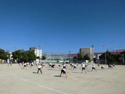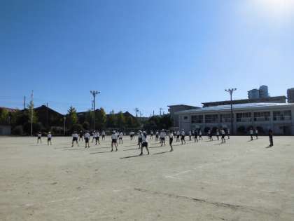 6時間目、5・6年生は運動場でソーラン節の練習をしていました。運動場での自分の立つ位置や隊形を確認し、高学年らしく力強いソーラン節を踊っていました。