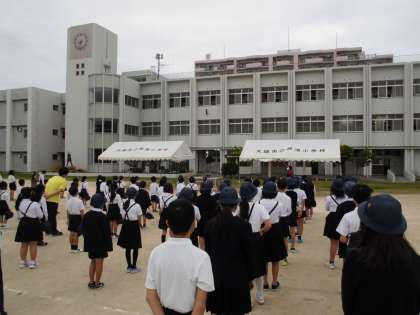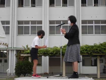 秋らしくさわやかなお天気の下、児童朝会を行いました。「大阪市小学校児童絵画・版画展」からの表彰状を校長先生から児童へ手渡しました。校長先生からは、今年は築港小学校の創立70周年にあたり、今月はヘリコプターから学校を撮影することや、来月は全校児童でお祝いをするイベントがあることなど、話されました。朝会担当からは、「幸せ宝箱週間」で友だちの良いところを見つけ、たくさんカードに書かれていることの紹介がありました。どの児童も朝会の話をしっかりと聴くことができました。