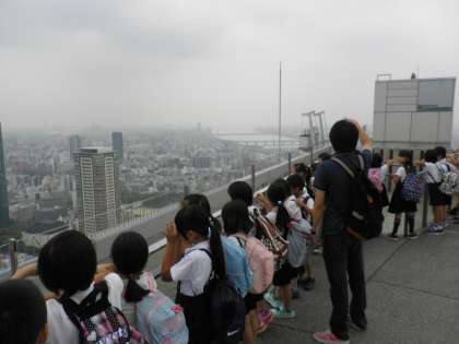 空中庭園に行くと、曇っていて遠くまでは見えませんでしたが、大阪駅周辺の建物はよく見えました。雨が降ってきたので、空中庭園のすぐ下の階でお弁当を食べました。帰りは大阪駅から外回り電車で弁天町まで行きました。駅によって電車の扉が閉まる時の曲が違い、子どもたちは楽しみにしながら聞いていました。