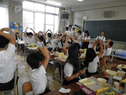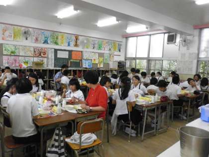 1年生と6年生、2年生と5年生、3年生と4年生が一緒に給食を食べました。