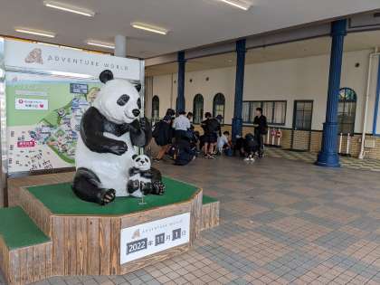 雨がやみました。11時にアドベンチャーワールドに到着。はじめに全員で写真を撮りました。ミールクーポンやパンフレットをもらってから入場します。
