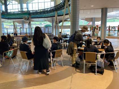 各グループに分かれて活動を開始しました。パンダを見るグループ、ショーを見に行くグループ、食事を取るグループ。雨も止んでおり、計画に沿って行動しています。