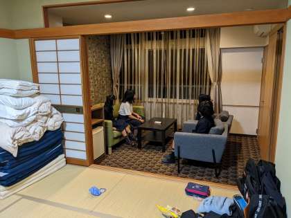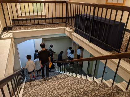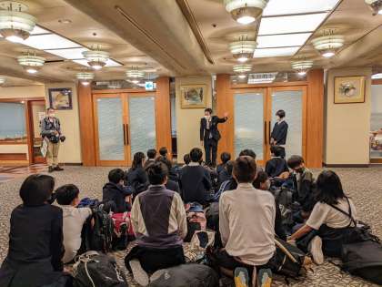 全員元気に宿舎である「ホテルむさし」に到着しました。開館式を終え、部屋に荷物を運んだ後、避難訓練をしました。とてもきれいな宿舎です。