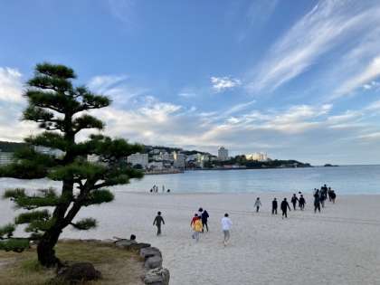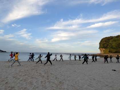 白良浜で朝の体操として、南中ソーランを踊りました。担任の先生の「構え」の一声で、子どもたちは素早く構えていました。