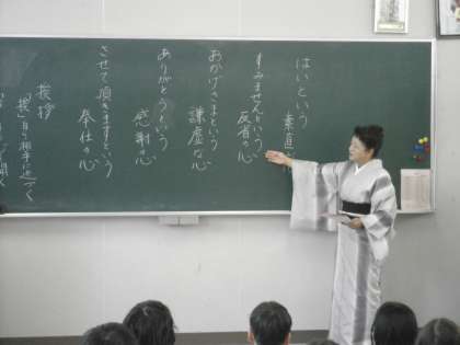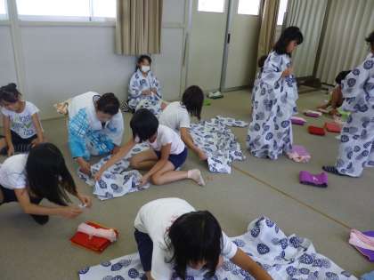 あいさつの仕方や物の渡し方、浴衣の着方やたたみ方を教えていただいています。
