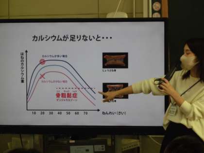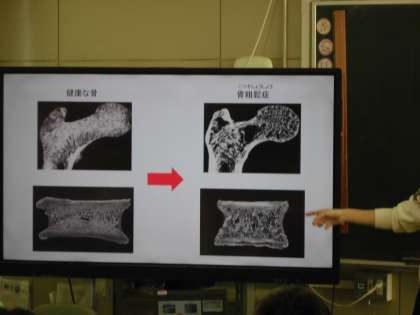 3時間目、6年生は栄養士さんをお招きして、栄養学習を行いました。生涯を通して健康に生活ができるように、今が丈夫な骨をつくることのできる大切な時期だと学ぶことができました。子どもたちは丈夫な骨とカルシウムが不足して骨粗鬆症になった骨を見比べ、カルシウムを摂ることの大切さを学ぶことができました。