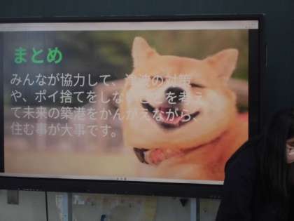 1時間目、6年生は国語科「町の幸福論」の学習でした。子どもたちは築港の町の現状について調べ、これから未来へ築港の町がどのように変わっていってほしいか、自分たちの考えや思いをまとめることができました。パソコンを使ってプレゼンテーションを作り、グループで発表に取り組んでいました。子どもたちは築港の町の現状と未来への町づくりについてしっかり考えることができました。