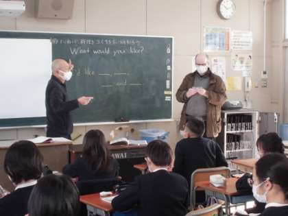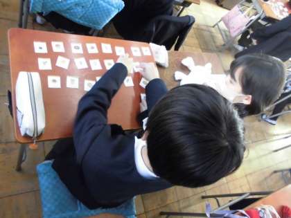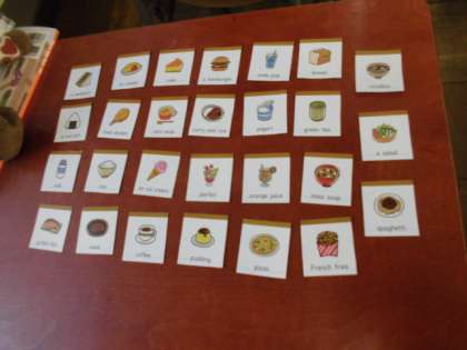 2時間目、5年生は英語学習でした。食べ物が描かれたカードを机に広げ、CーNET担当が「What would you like?」「I’d like a hamburger」「a sandwich」「coffee」「fried chicken」と言った後、同じように発音し、その食べ物が描かれているカードを選んでいました。隣同士でペアになり、とても楽しそうに英語学習に取り組んでいました。