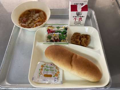 一口トンカツは、給食室でひとつずつ衣をつけながら揚げています。衣がサクッとして美味しい人気の献立です。ミネストローネとの相性も抜群です。