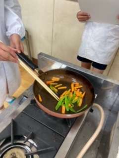 子ども達はグループのメンバーで協力して、自分たちで選んだ野菜を切ったり、順番や火加減を考えて炒めたりしました。