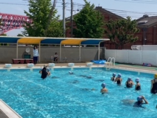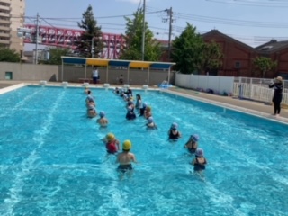 プールの中でエビカニクスのダンスを楽しく踊った後、宝探しをするなどして、水泳学習をしました。