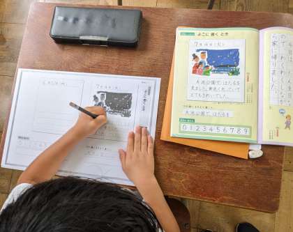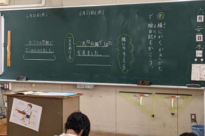 今日のめあては、「横に書く書き方で、絵日記を書こう」です。お手本をなぞり書きした後は、プールに入った時のことを書きました。姿勢に気をつけて丁寧に書くことができていました。