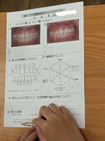 歯科衛生士さんに来ていただき、歯と歯茎の健康チェック行いました。鏡を見ながら自分の歯を観察する6年生。歯磨きの回数やおやつの食べ方、好き嫌い、かむ回数などで健康チェックを行いました。