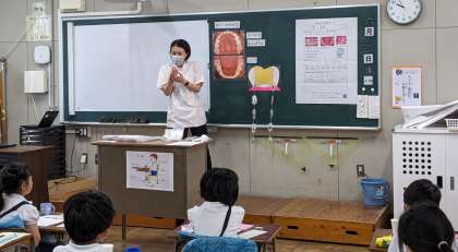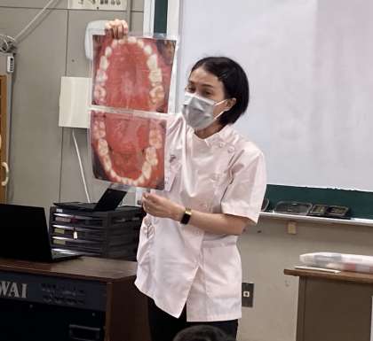 歯科衛生士さんに来ていただきました。歯垢(しこう)を赤く染めて歯垢がついていないかを調べました。