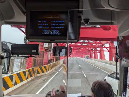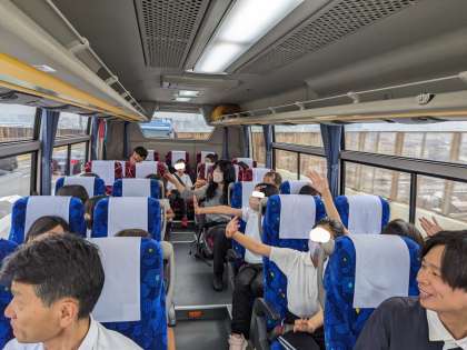 バスの中から手を振っている子どもたち。その先には、築港小学校や子どもたちの住んでいる町が見えます。また、テレビが出てくると「すごい!」と歓声の声が。ピノキオのDVDを見ています。