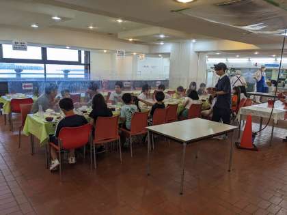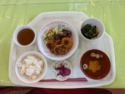 夕食は、チキンステーキ、ミニドーナツコロッケ、ボイルキャベツ、たこ焼き、菜の花と人参浸し、お吸い物、ごはん、しば漬けです。美味しくいただきました。