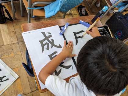 5年生は「成長」と筆で書いていました。手本を見ながら丁寧に書いており、集中していた姿が素晴らしかったです。