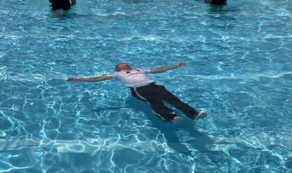 水上消防署の方に来ていただき、服を着た状態でペットボトルを使って浮く方法を学びました。溺れている人がいたら、助けに行くのではなく、ペットボトルやボールなど浮くものを投げて助けることが大事だと教えていただきました。ペットボトルを投げる時は、少し水を入れて投げると思ったところに投げることができると教わりました。今日はかなり暑かったので、何度も水分補給をしたり、テントの下の陰で休憩したりしながら学習しました。水上消防署の皆様、ありがとうございました。