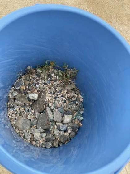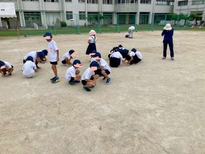 9月4日(月)の朝会は、石拾い朝会でした。運動会の練習や本番でけがをしないように、学年ごとに分担を決めて、石を拾いました。