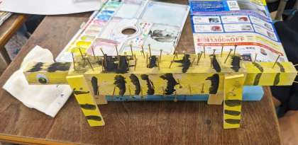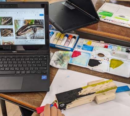 3年生は図画工作で、くぎと木材を使って動物をつくっています。くぎをたくさん打って髪の毛に見立てたり、オリジナルの色を作って塗ったりして作品づくりを楽しみました。