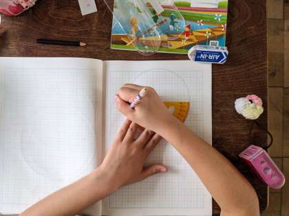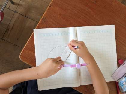 「円と球」の学習をしました。まるい形のいろいろなかき方を考えていました。穴を2つあけたかたい紙を使い、ノートに円を描いたり、分度器やセロハンテープを使って円を描いていました。きれいな円を描くために何度も挑戦していました。