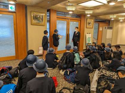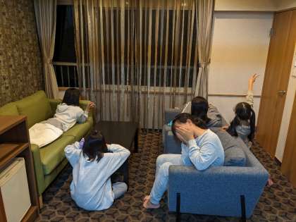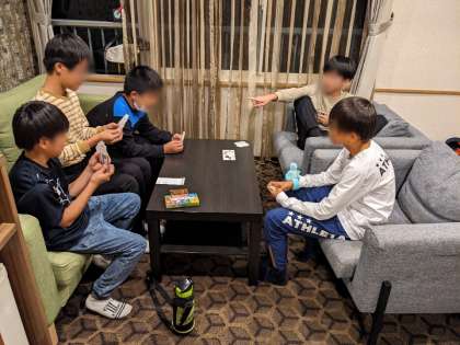 予定より少し早い午後4時15分にホテルむさしに到着しました。入館式をした後、避難訓練をし、部屋でゆっくりカードゲームなどをして過ごしました。