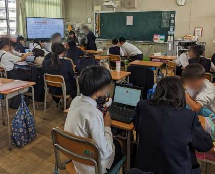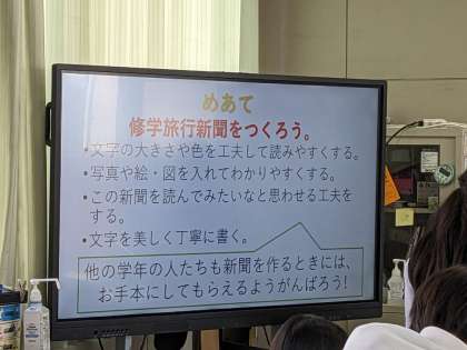 総合的な学習の時間に「修学旅行新聞」をパソコンでつくっています。読んでみたくなる新聞になるようにグループで話し合いながら文章を考えていました。