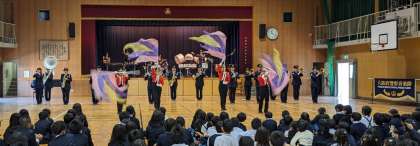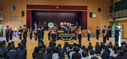 今日は全児童が講堂に集合し、大阪府警察音楽隊の皆様による、演奏を聴きました。はじめは席に座っての演奏で、その後はマーチングステージでした。あいみょんの「愛の花」やSHISHAMOの「明日も」、西部警察の曲などたくさんの曲を演奏してくださいました。マーチングでは、正義と悪をイメージして演奏されていました。「私達だけでは犯罪を0にできません。一緒にヒーローになって安全な街をめざしましょう」という言葉があり、最後に「府民の皆様が安全に暮らせるように音楽でパトロールをしていきます」という言葉で締めくくられました。児童代表として6年生が感想とお礼を伝えました。曲ごとに具体的な感想を伝え、さすが最高学年だと思いました。楽器を片付けていると講堂に1年生がやってきて、「ありがとうございました。かっこよかったです」と大きな声でお礼を伝えていたのがとても微笑ましかったです。感動した気持ちを素直に表現していました。いろいろな学年の子どもたちに休み時間に感想を聞いてみると、「すごくよかった」「感動した」「私も楽器を演奏してみたい」「楽器を演奏しながら移動するのはすごく楽器が重くて大変だと思う」と言っていました。音楽隊の方の背筋がピンと伸びていた姿も素晴らしく、感動の音楽鑑賞会でした。ありがとうございました。