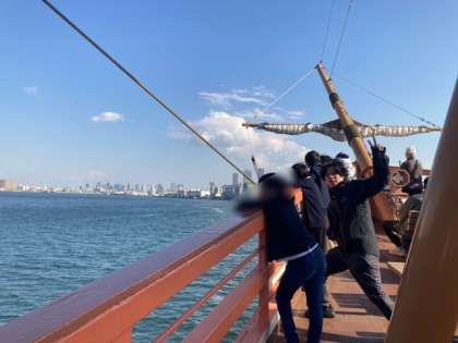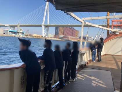 その後、5年生の子ども達を乗せたサンタマリア号は、大阪港クルーズに出発しました。気持ちの良い陽気と海風を受けて、子ども達は「USJが見えた。IKEAを見つけた。魚もいる。」と大興奮でクルーズを楽しみました。
