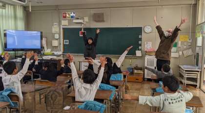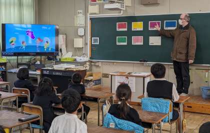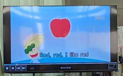 マニ先生と英語の勉強をしました。歌を歌いながら赤や青、緑、紫などいろいろな色の英語での言い方を学びました。