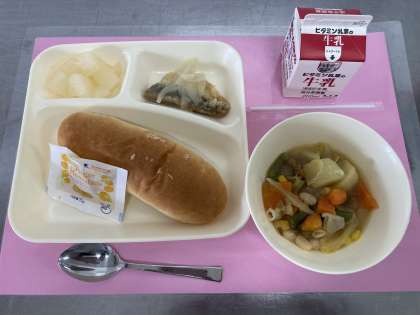 今日の給食では、たまねぎをいためて、砂糖、塩、米酢、ワイン、レモン汁で作ったマリネ液をからませた、あじのレモンマリネが登場しました。