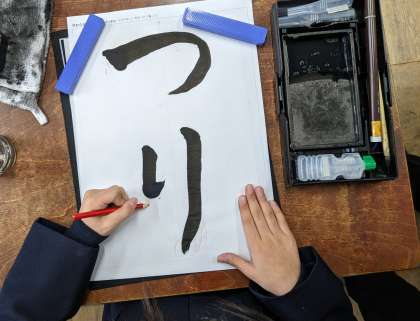 3年生は漢字の筆使いとの違いに気をつけて「つり」と習字で書きました。始筆と終筆に気をつけて書くことができていました。