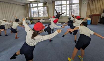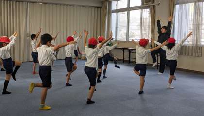 昨日の雨で運動場が使用できなかったため、2年生は多目的室で体育をしました。片足立ちをするなど体幹を鍛える運動をしました。両手を上げながら片足をあげるのは意外と難しいのですが、子どもたちはがんばってバランスをとっていました。