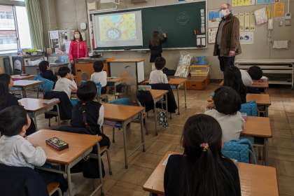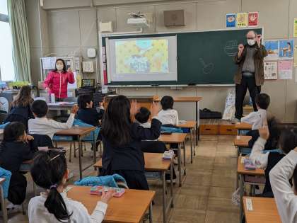 今日はマニ先生と勉強するのが最後の日です。1年生は英語で歌を歌いました。ゼリーがぷるぷるしている様子やポップコーンがはじける様子、缶のジュースがシュワシュワしている様子を体で表現しながら歌いました。みんな笑顔で元気よく歌いました。マニ先生、今まですべての学年に英語を教えてくださり、ありがとうございました。