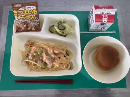 「おさつチップス」は、はじめて給食に登場します。国産のさつまいもをうすく切り、油で揚げ、砂糖であまく味をつけています。