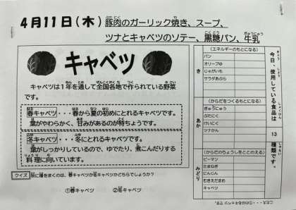 キャベツはやわらかく甘みがあり、子どもたちが大好きなツナと炒めた献立は大人気でした。