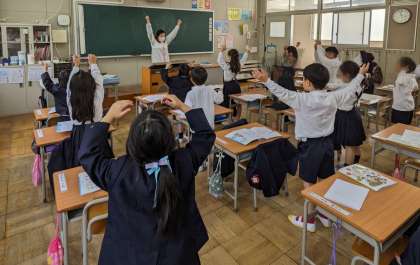 築港小学校の校歌を踊りながら歌いました。創立70周年の時に校歌をアレンジしていただき、ダンスもつくっていただきました。1年生は初めてでしたが、すぐにダンスを覚えていました。踊り終わってからある子どもが「涙が出る」と言うので、びっくりしましたが、理由を聞いていると、「初めて(踊りや歌を)知ったから」と話していました。感動の涙のことでした。1年生の感性の豊かさに気づかされました。