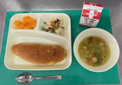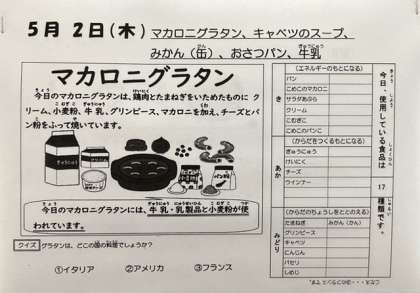 今日のマカロニグラタンは、鶏肉とたまねぎをいためたものに、クリーム、小麦粉、牛乳、グリンピース、マカロニを加え、チーズとパン粉をふって焼いています。