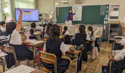 4年生は付点8分音符や16分音符について学習していました。また、長調についても学びました。子どもたちは元気よく手をあげて発表していました。