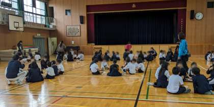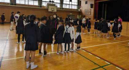 木曜日の朝は児童集会があり、たてわり班ごとに並んでゲームなどの活動をします。今日は、今年度初めてたてわり班ごとに集合しました。自己紹介をした後、班ごとに並び替えゲームをしました。1年生から6年生まで協力していました。