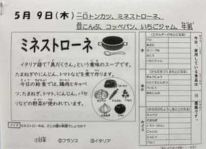 ミネストローネはイタリア語で「具だくさん」という意味のスープです。たまねぎやにんじん、トマトなどを煮て作ります。今日の給食では、鶏肉とキャベツ、たまねぎ、トマト、にんじん、パセリなどの野菜が使われています。